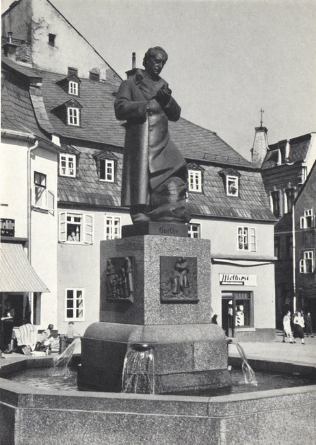 Goethebrunnen mit Molkereigeschäft im Hintergrunde