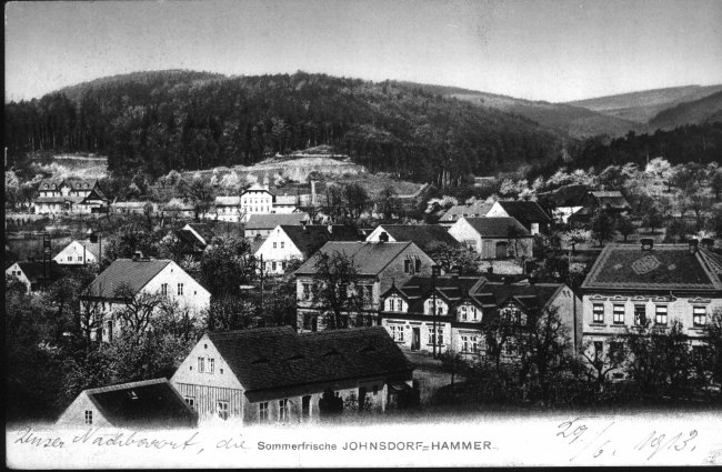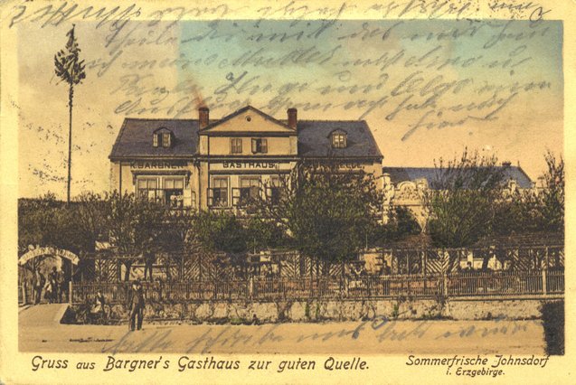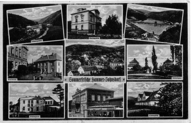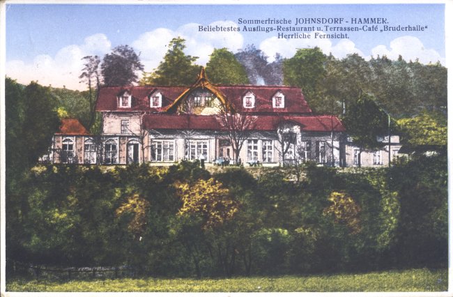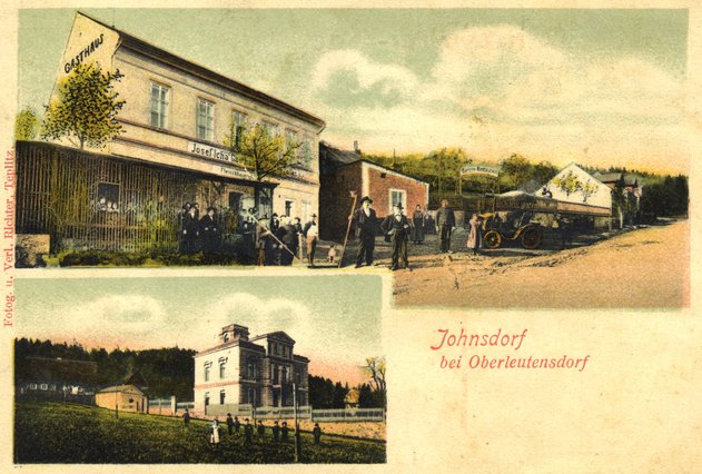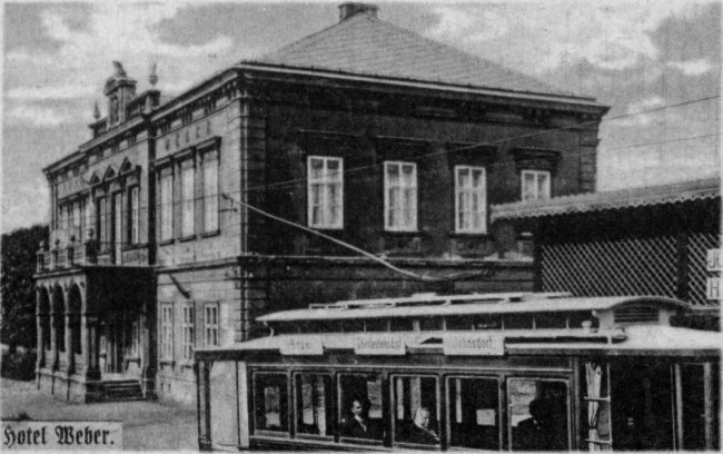 Hotel Weber mit Waggon der Straßenbahnlinie Brüx-Oberleutensdorf-Johnsdorf um 1943