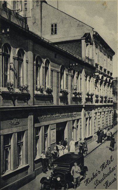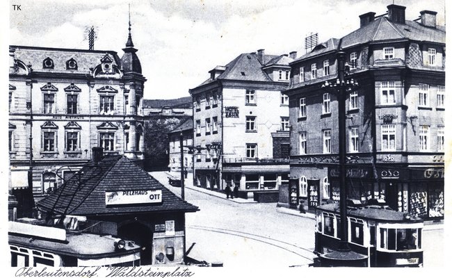 Waldstein-Platz mit Hotel Zahn, Pelzhaus Ott und Wagen der