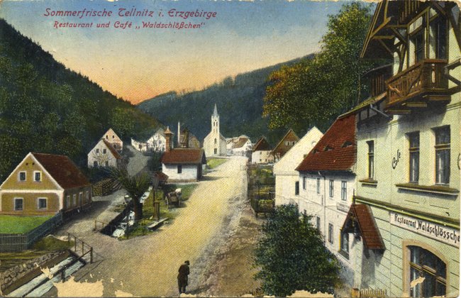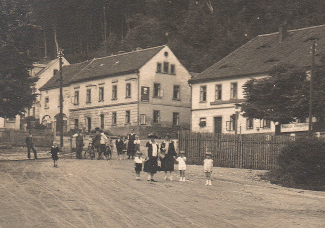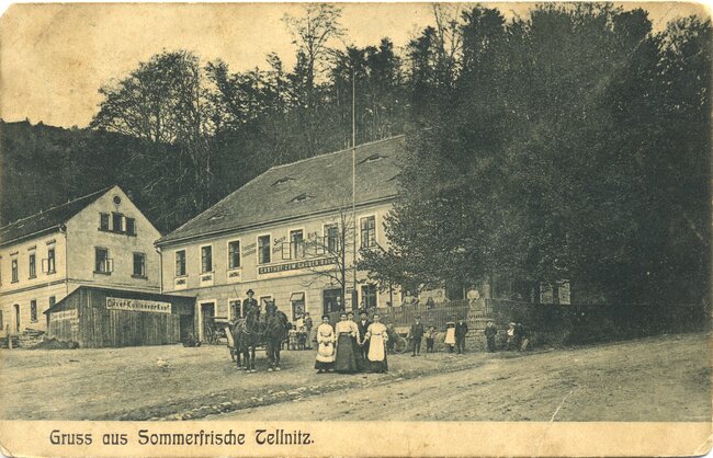 vor Gasthof "Grüner Baum" Werbung "Saazer Bürgerbräu"